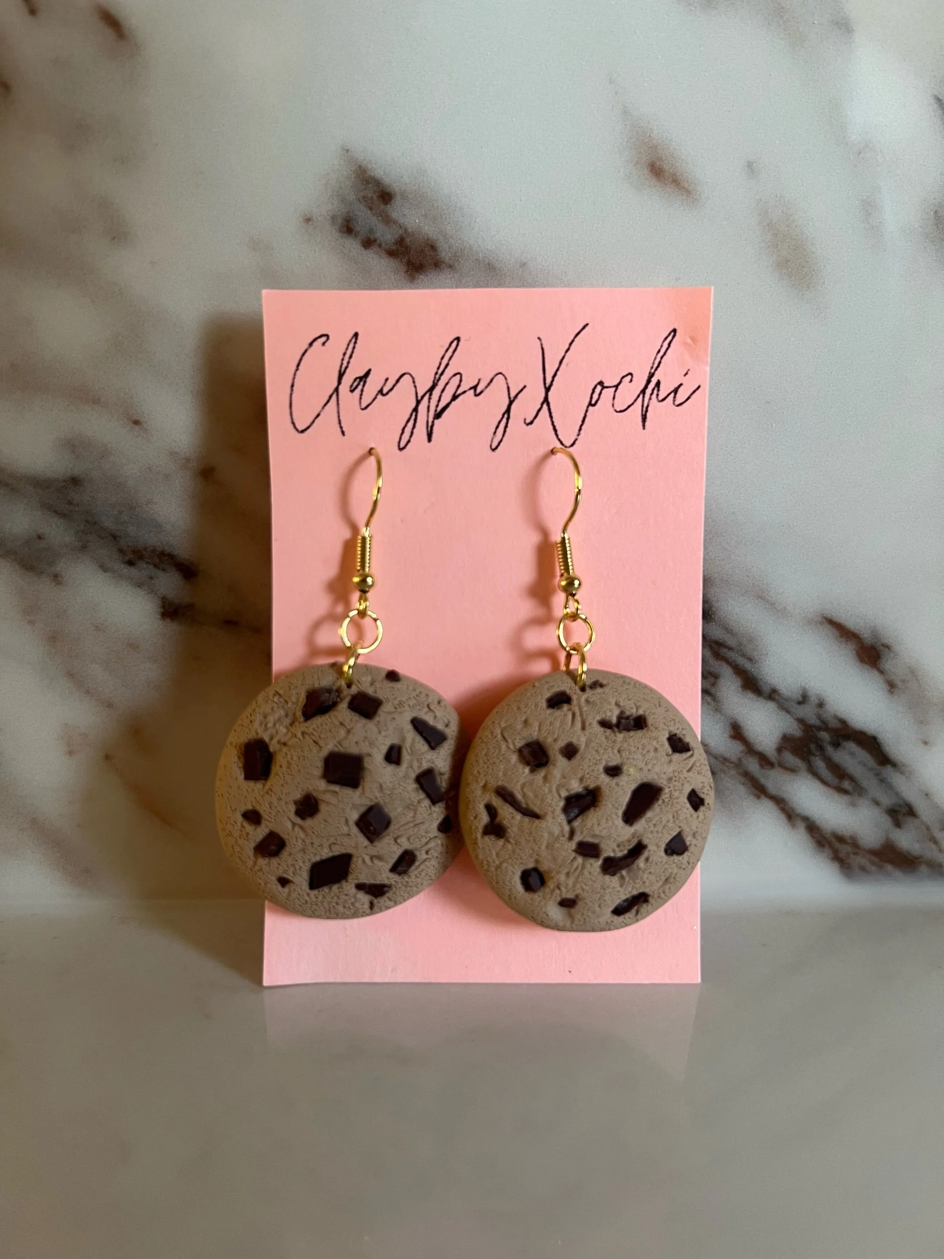 Earrings › Chocolate Chip Cookies Image 1 of 2 Image 2 of 2 Chocolate Chip Cookies $15.00 Chocolate chip cookie dangle earrings with 24k gold plated brass hoop Attachment: Hoop Hook Add To Cart Added! Chocolate chip cookie dangle earrings with 24k gold plated brass hoop